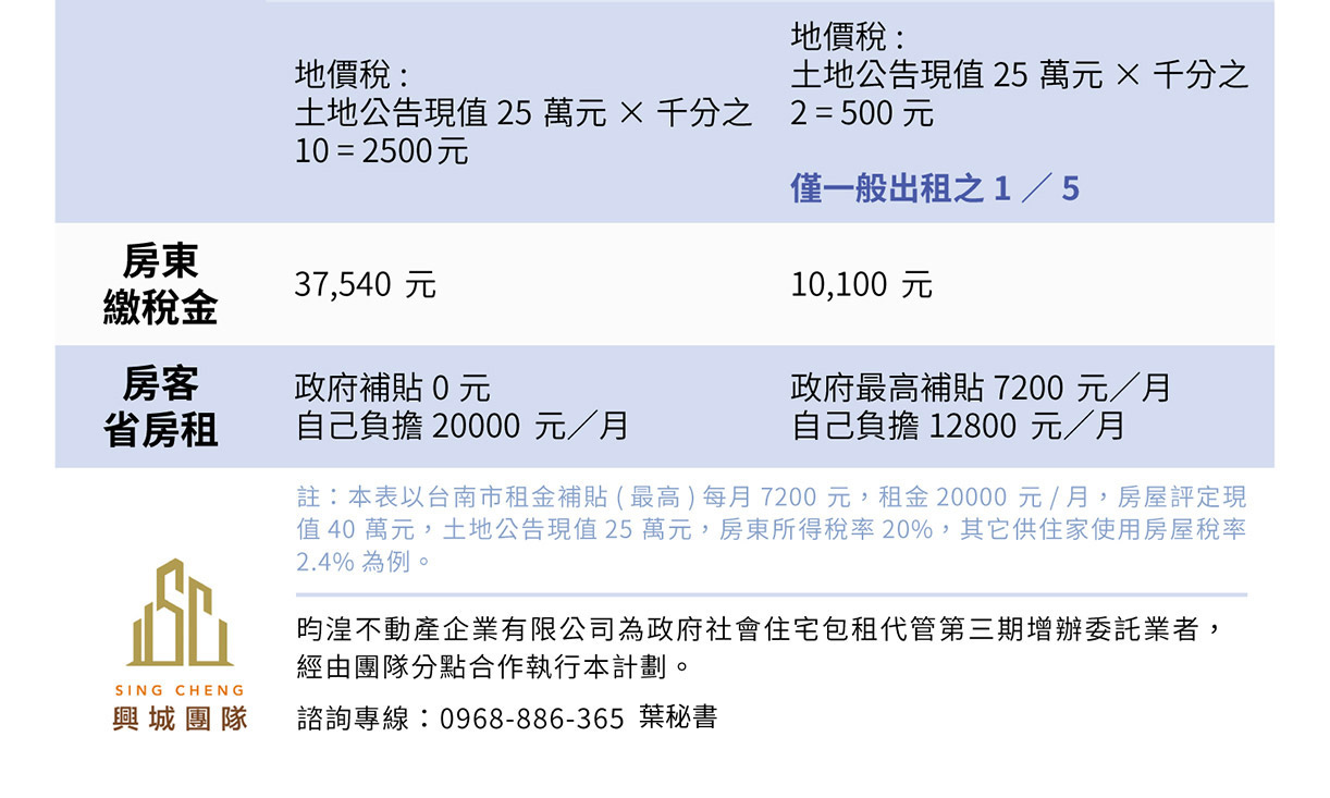 社會公益住宅 什麼是社會住宅? 社會住宅簡單來說就是由政府營運管理(直接或補助)興建或民間擁有之合於居住標準的房屋,採只租不賣模式,以低於市場租金或免費出租給所得較低的家庭或特殊的弱勢對象的住宅。 出租對象包含可分為三大類: 1.未設籍於當地且在該地區就學、就業有居住需求者 2.經濟或社會弱势者 3.身心障礙者、老人、低收入戶或特殊境遇家庭等,2017 年開始,政府以「以興建、包租代管等方式,8 年興辦 20 萬戶社會住宅為目標,其中 12 萬戶為建、8 萬戶包租代管方式辦理,協助弱勢家庭及就業、就學青年租屋」。 社會住宅包租代管是什麼? ( 一 ) 包租代管:簡單說即是政府委託管理的業者與房東簽訂3 年包租約後,於包租約期間,以二房東的角色,將住宅轉租給符合社宅條件的租客,並提供管理社宅的服務。 ( 二 ) 代租代管:業者協助房東出租住宅給符合社宅條件的房客,由房東與房客簽訂租約,一年一期,最長3 年,並提供管理社宅的服務 ■市場租金上限: 台南市加入本計畫物件每月市場租金不得高於29,000 元。 ■符合條件的租客可以市場租金的8 折或9 折承租社會住宅。