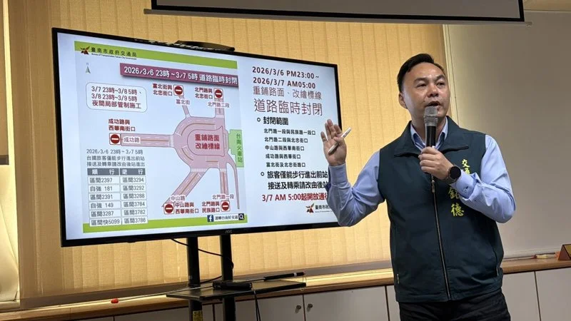 施工單位預計自2026年3月6日(五)晚間11時起至翌日清晨5時暫時封閉站前道路,進行鋪面及標線作業。封閉範圍包括北門路一段與民族路一段口、北門路二段與北忠街口、中山路與西華南街口、成功路與西華街口、富北街及北忠街路口等5處路口。期間車輛無法行經圓環。